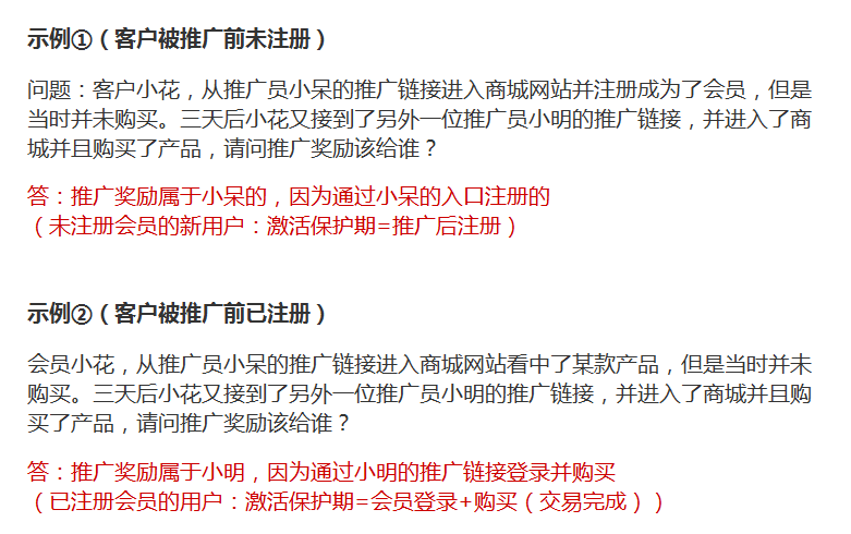 客戶保護(hù)期的定義為“當(dāng)用戶首次進(jìn)入某推廣員的鏈接/二維碼并購(gòu)買產(chǎn)品或注冊(cè)成為會(huì)員時(shí),該用戶在指定的保護(hù)期內(nèi)則綁定為該推廣員的客戶,之后無論用戶去到哪里下單(其他推廣員的鏈接或者總店),推廣員都可以得到獎(jiǎng)勵(lì);當(dāng)保護(hù)期到期后,用戶再點(diǎn)擊鏈接,則保護(hù)期自動(dòng)續(xù)期,如保護(hù)期為15天,則續(xù)期15天”。