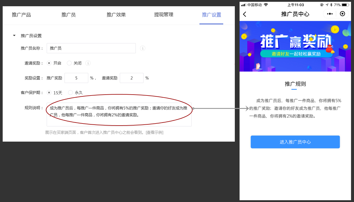 a-4.規(guī)則說明:可自定義推廣員的推廣規(guī)則,規(guī)則將會(huì)展示在買家端頁(yè)面,當(dāng)客戶首次進(jìn)入推廣員中心之前會(huì)看到。
