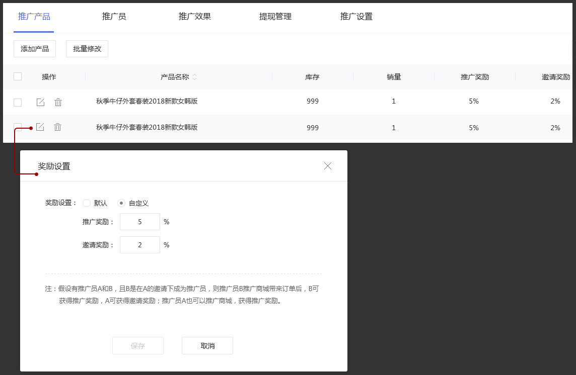 ③點(diǎn)擊“推廣產(chǎn)品”標(biāo)簽項(xiàng),您可自行添加參與推廣的活動(dòng)產(chǎn)品。添加推廣產(chǎn)品后,您可自定義其推廣獎(jiǎng)勵(lì)和邀請(qǐng)獎(jiǎng)勵(lì)的百分比,也可以選擇默認(rèn)獎(jiǎng)勵(lì)。參與推廣的活動(dòng)產(chǎn)品的產(chǎn)品詳情頁(yè)會(huì)顯示“賺”。