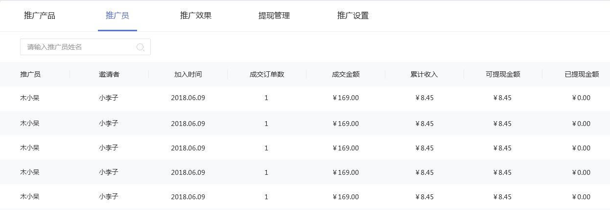 ④點(diǎn)擊“推廣員”標(biāo)簽項(xiàng),您可在此處查看推廣員列表,每個(gè)推廣員會(huì)顯示其邀請(qǐng)者、加入時(shí)間、成交訂單數(shù)、成交金額、累計(jì)收入、可提現(xiàn)金額、已提現(xiàn)金額。