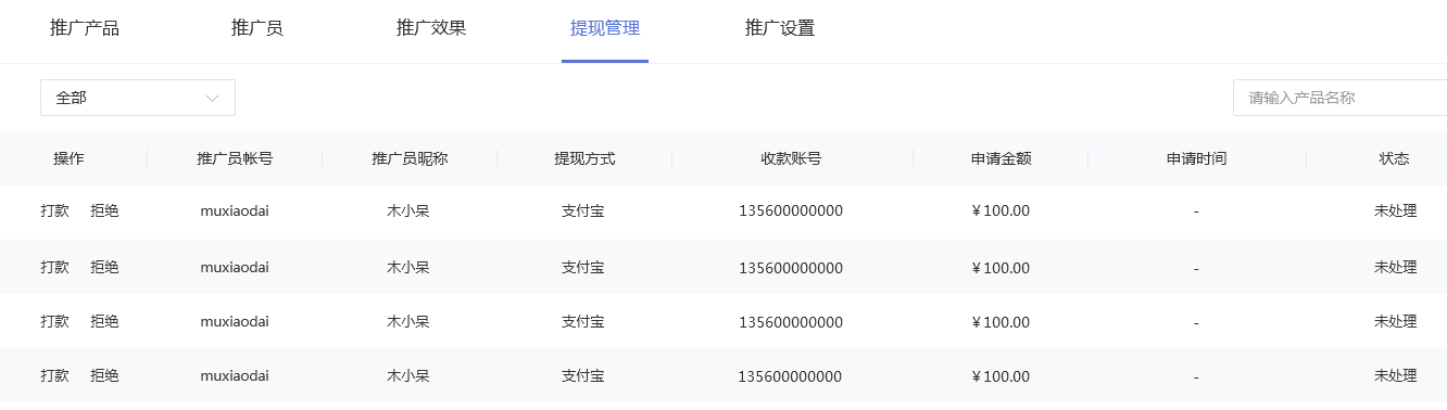 當(dāng)選擇結(jié)算方式為“系統(tǒng)自動(dòng)結(jié)算”時(shí),商家只需在推廣員發(fā)起獎(jiǎng)勵(lì)提現(xiàn)時(shí),進(jìn)入“網(wǎng)站管理后臺(tái)--營(yíng)銷--推廣員--提現(xiàn)管理”處點(diǎn)擊【打款】,系統(tǒng)會(huì)自動(dòng)打款到推廣員的提現(xiàn)賬戶?!跋到y(tǒng)自動(dòng)結(jié)算”支持提現(xiàn)到支付寶和微信零錢,但商家成功使用此結(jié)算方式的前提是:已在網(wǎng)站管理配置微信支付,并在微信支付商戶平臺(tái)開通了企業(yè)付款功能;已在網(wǎng)站管理配置支付寶支付,并在支付寶商戶平臺(tái)開通了單筆轉(zhuǎn)賬到支付寶功能。