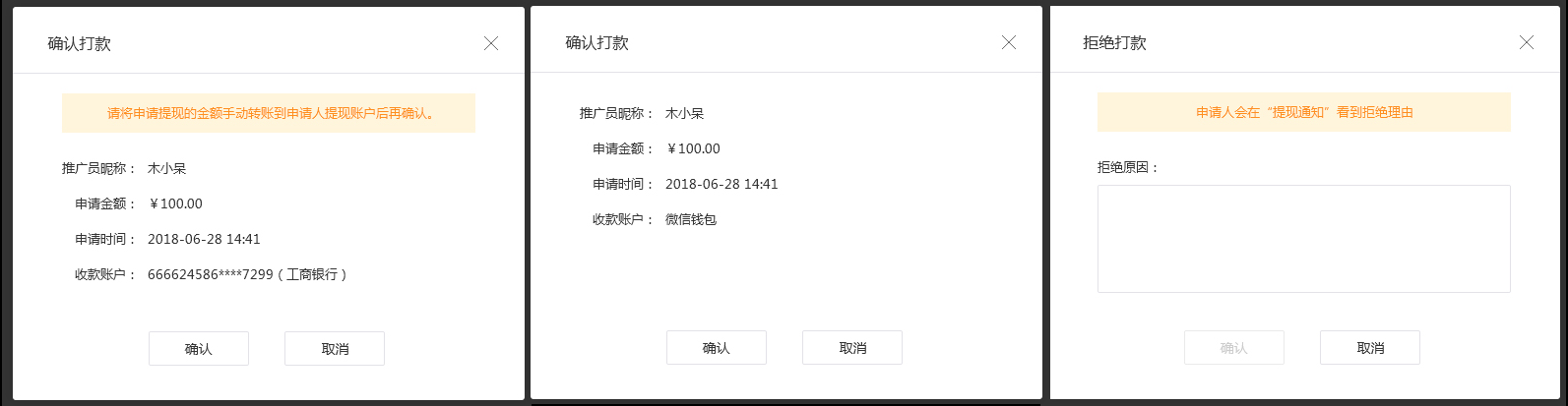 ⑥點(diǎn)擊“提現(xiàn)管理”標(biāo)簽項(xiàng),您可在此處對(duì)推廣員的提現(xiàn)申請(qǐng)進(jìn)行操作。當(dāng)提現(xiàn)方式為“商家手動(dòng)結(jié)算”的結(jié)算方式時(shí),商家需另外轉(zhuǎn)賬再到這里進(jìn)行確認(rèn)操作;當(dāng)提現(xiàn)方式為“系統(tǒng)自動(dòng)結(jié)算”的結(jié)算方式時(shí),商家只需在這里點(diǎn)擊“確認(rèn)”,系統(tǒng)自動(dòng)打款至對(duì)應(yīng)的支付寶或微信零錢賬戶中。