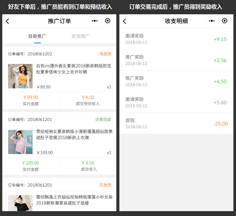 ③好友下單后,推廣員能在“推廣員中心--推廣訂單”中查看訂單和了解預(yù)估收入,訂單交易完成后,得到獎(jiǎng)勵(lì)收入,在“推廣員中心--收支明細(xì)”中可查看每一筆收支詳情。